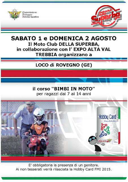 Il primo weekend d'Agosto "Bimbi in moto" replicherà all'EXPO ALTA VAL TREBBIA a Loco di Rovegno con esibizione dei piloti del Superba impegnati nel tricolore.