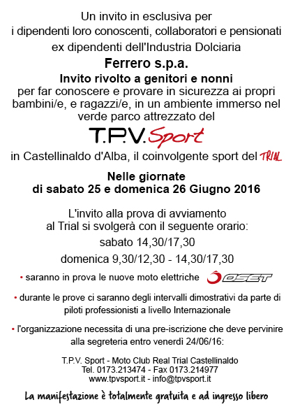 Nelle giornate di sabato 25 e domenica 26 giugno il TPV Sport di Castellinaldo (CN) organizza uno speciale invito al trial rivolto ai figli dei dipendenti della Ferrero S.p.A. ed ai loro conoscenti ed amici.