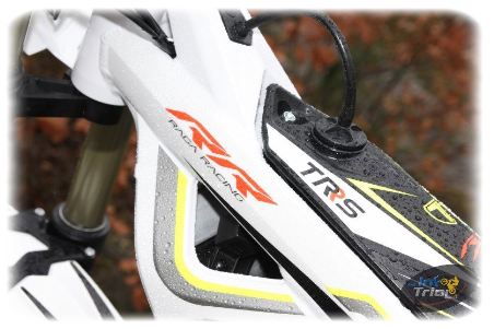 All’anteriore TRS per la versione RR ha optato per una pinza Braktec monoblocco a quattro pistoncini, tubo in treccia metallica, utile a mantenere costante e precisa la frenata anche nelle condizioni più gravose il tutto “stimolato” da una pompa sempre Braktec.